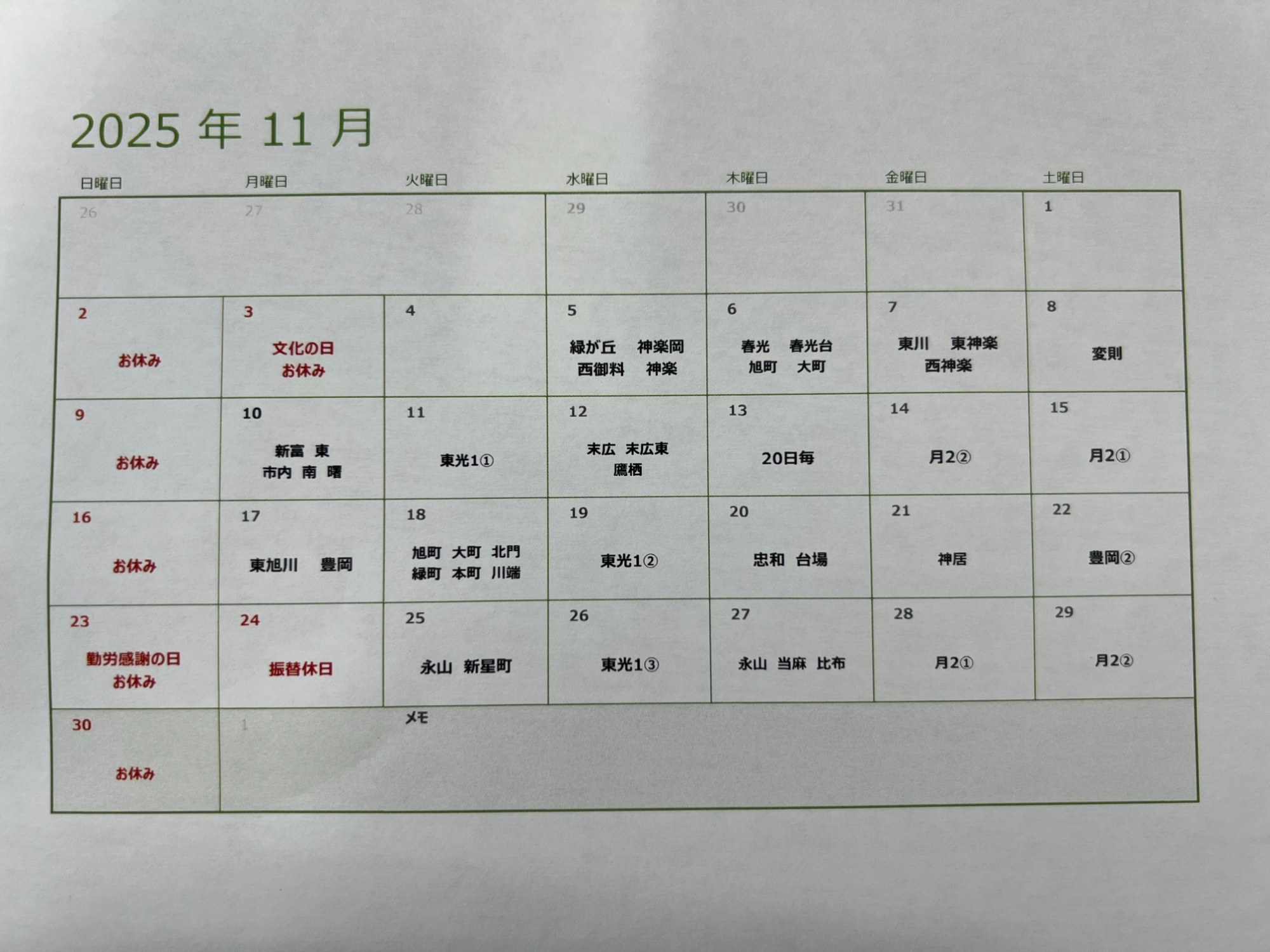 11月の定期灯油配送リストになります。